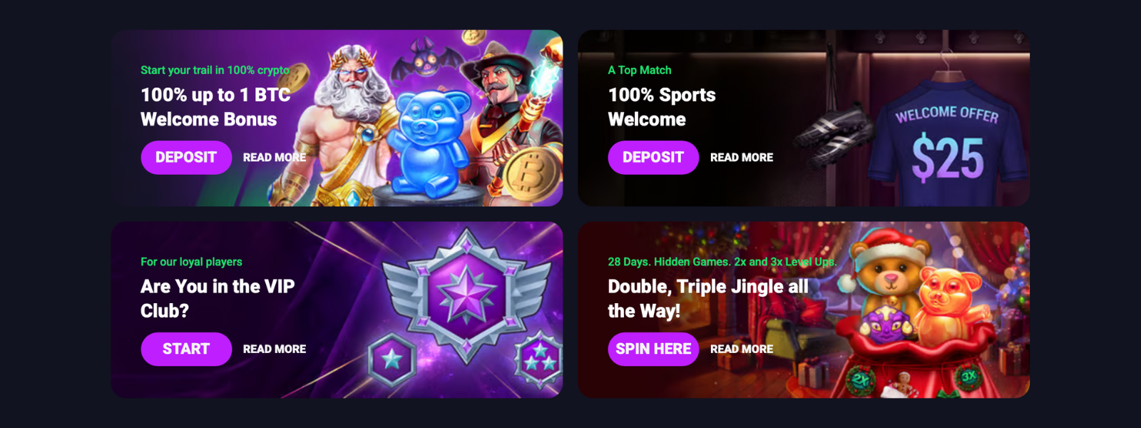 The casino provides a 100 percent welcome bonus up to 1 BTC. A separate sports welcome offer with a no risk bet up to 25 USD is also available. Terms and wagering vary by region.